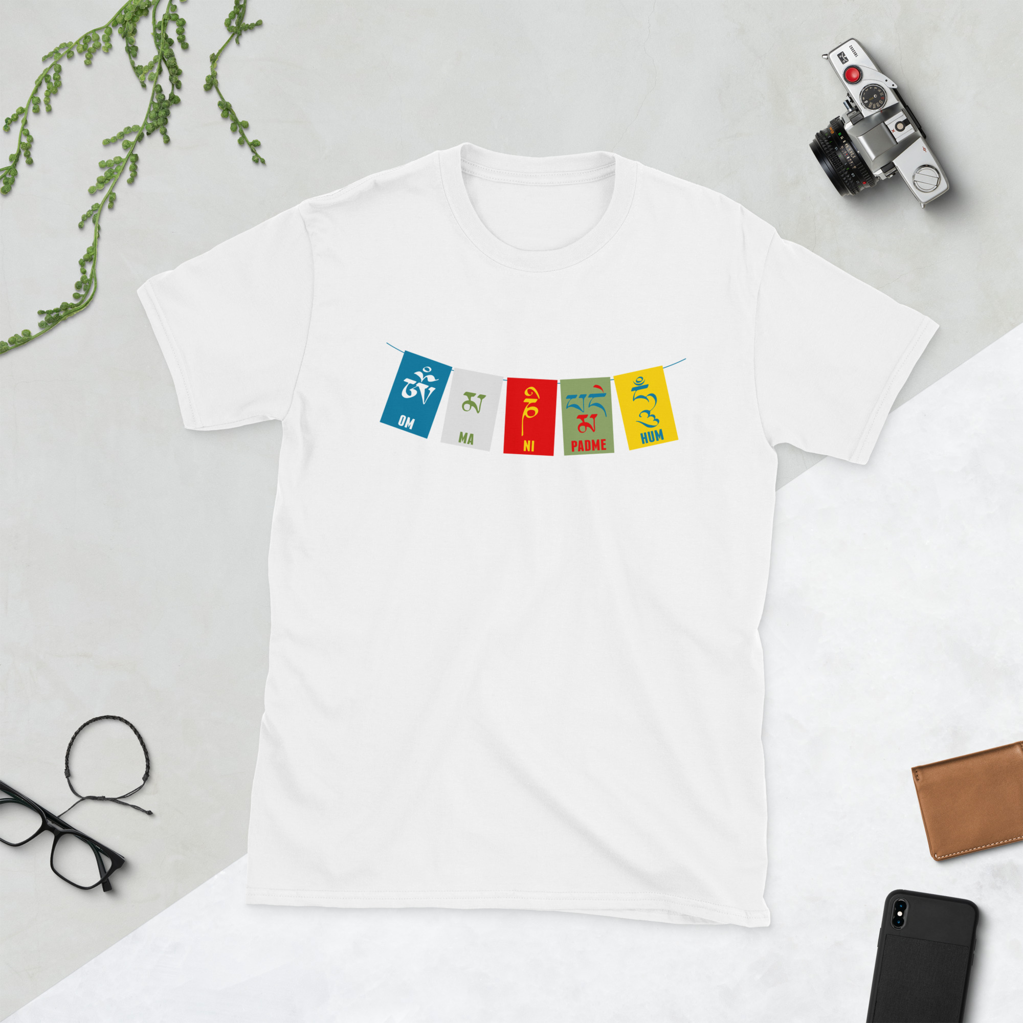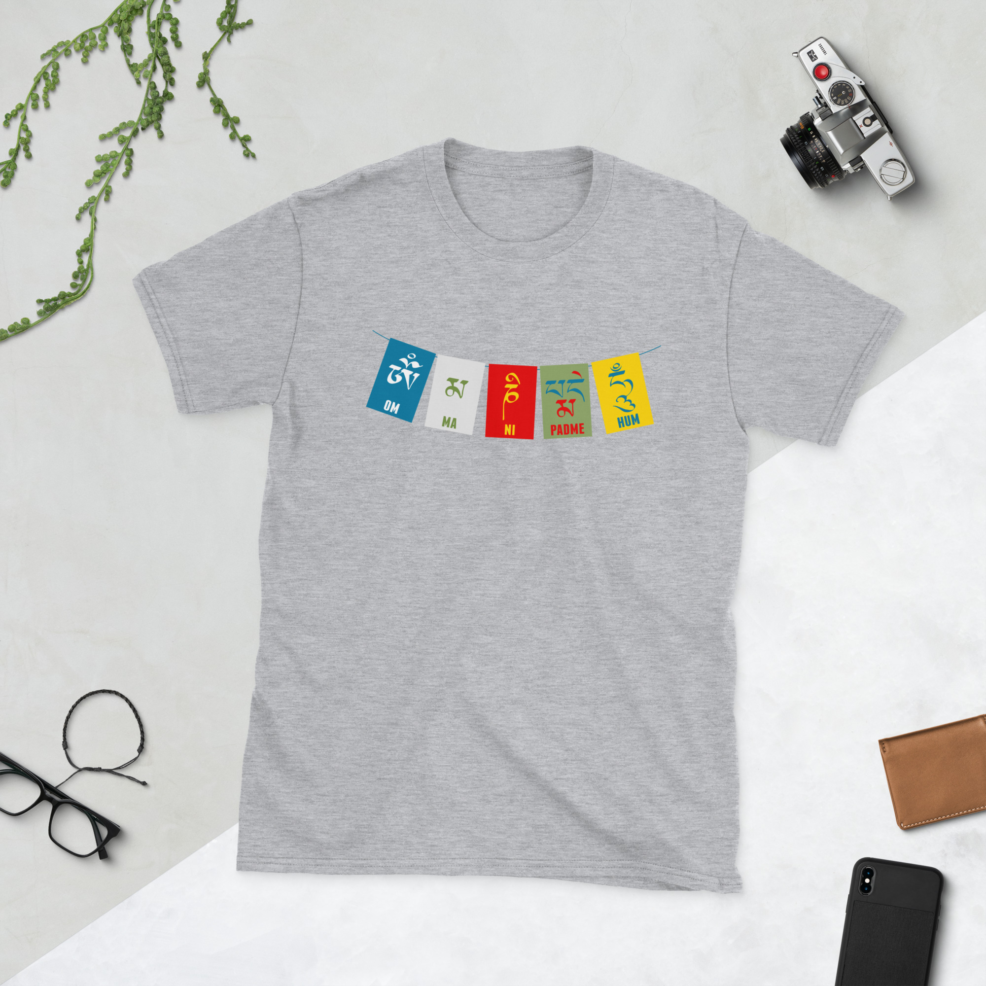 This Buddhist Prayer Flag Short-Sleeve Unisex T-Shirt is a great way to show your love for Buddhism and to spread peace and positivity. The shirt features a beautiful design of Buddhist prayer flags, which are traditionally used to promote peace, compassion, and good fortune. The shirt is made from high-quality materials and is comfortable to wear.